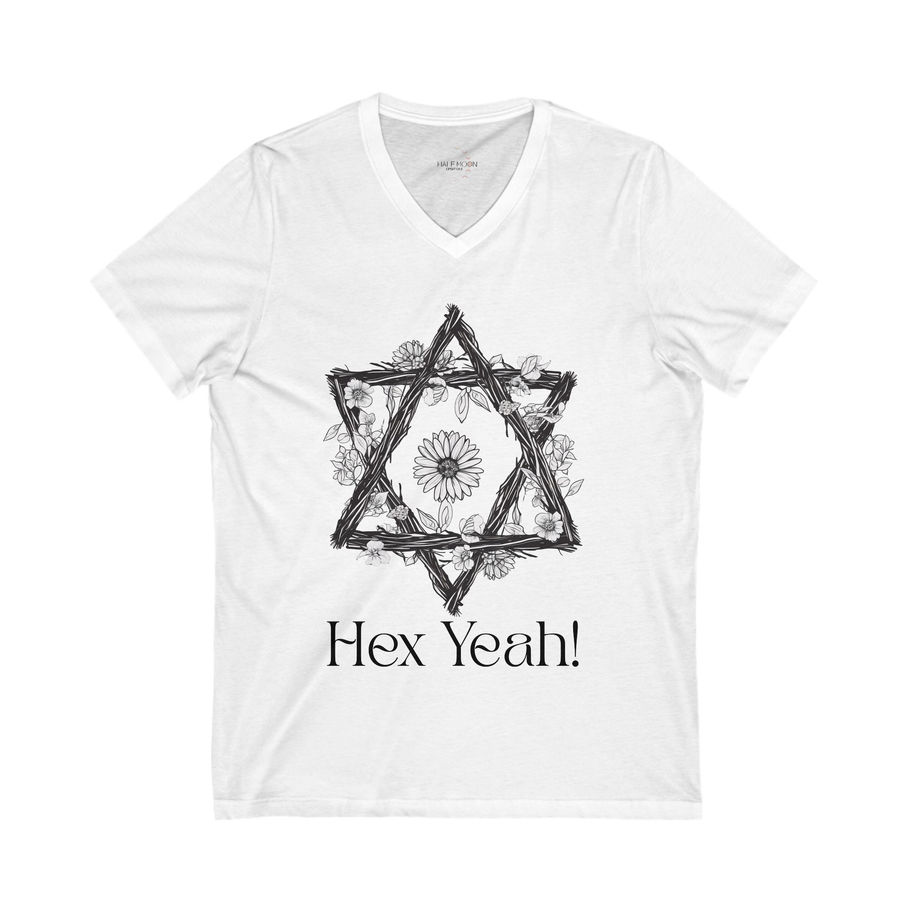 Embrace your magical side with our stylish "Hex Yeah" V-Neck Tee. This comfortable and flattering tee features a bold "Hex Yeah" graphic, perfect for adding a touch of witchy charm to your everyday look. The classic V-neck design offers a relaxed and versatile fit, making it ideal for layering or wearing on its own. Crafted from soft, quality fabric, this tee is perfect for expressing your unique style and love for all things mystical.