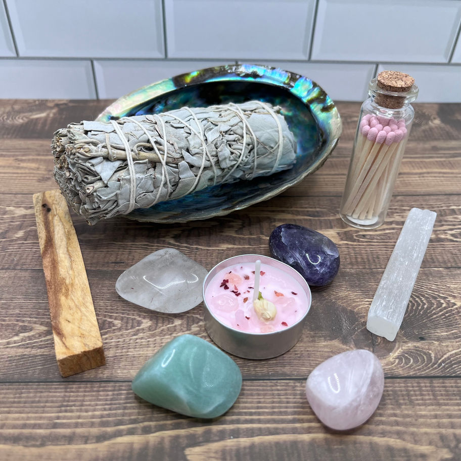 This Intention Starter Kit contains one (1) each of the following: Sage bundle, Palo Santo, Abalone Shell, Clear Quartz, Rose Quartz, Amethyst, Green Aventurine, Selenite stick, a Self-Love intention candle, and a small jar of matches (20 count).